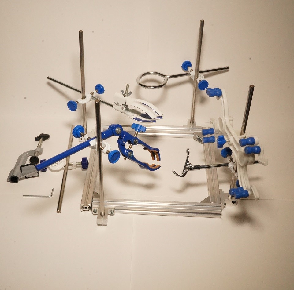В комплект входят комплектующие, изображенные на 1 фото: основание штатива, стойки 4 шт плюс 1 шт запасная, держатели стоек 4 шт с винтами и гайками, зажимы-крепления 5 шт, кольцо для воронок 60 мм 1 шт, лапка с 4-мя пальцами с переменным углом, универсальная лапка, зажим для пробирок/термометров, струбцина для крепления основания к столу, ключ-шестигранник для винтов-шестигранников.